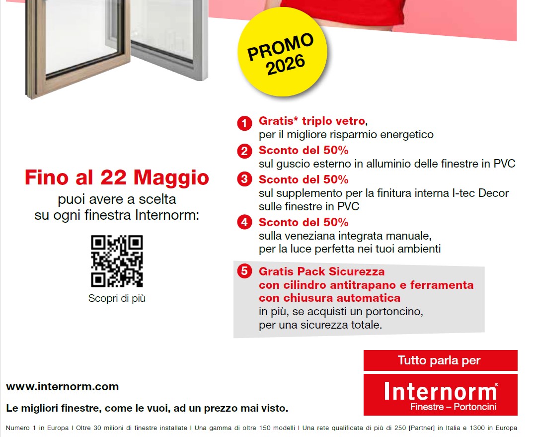 Dal 16 marzo al 22 maggio 2026, Internorm lancia una promozione esclusiva valida su tutti i modelli di finestre, comprese le ultime novità. Un’occasione unica per rinnovare i tuoi serramenti con soluzioni ad alte prestazioni, design personalizzabile e vantaggi economici concreti.